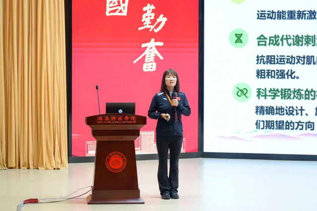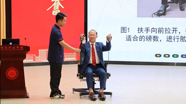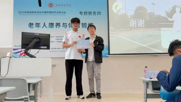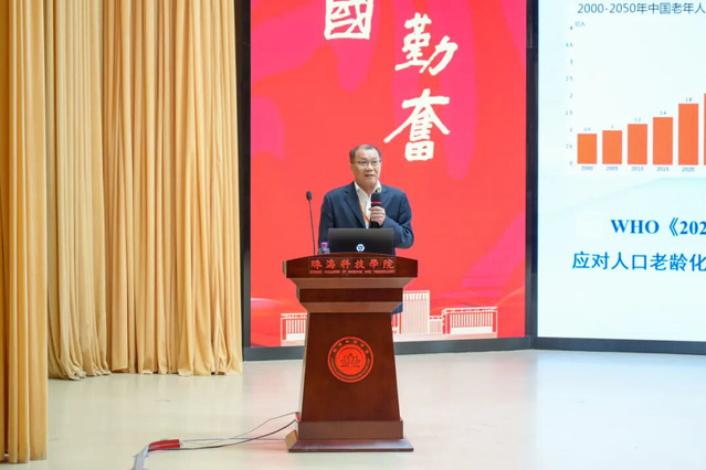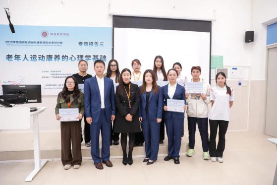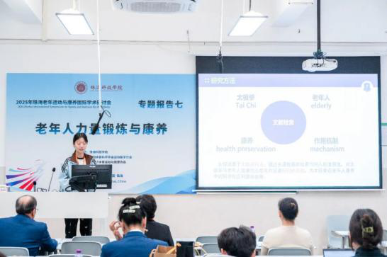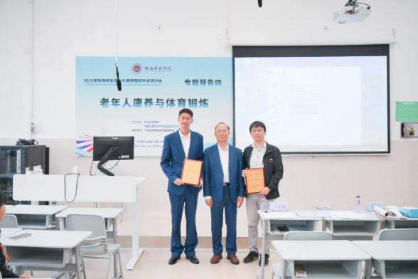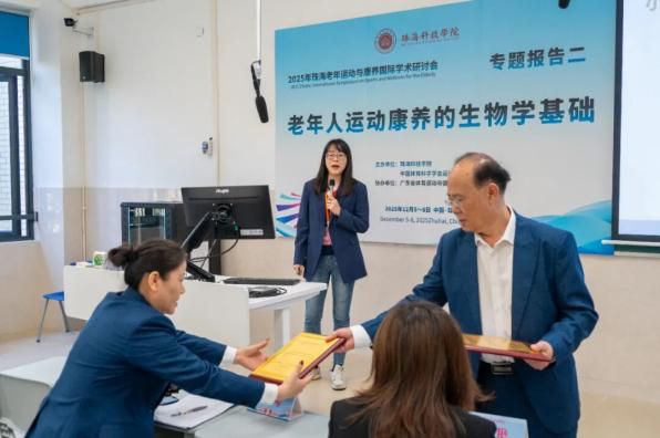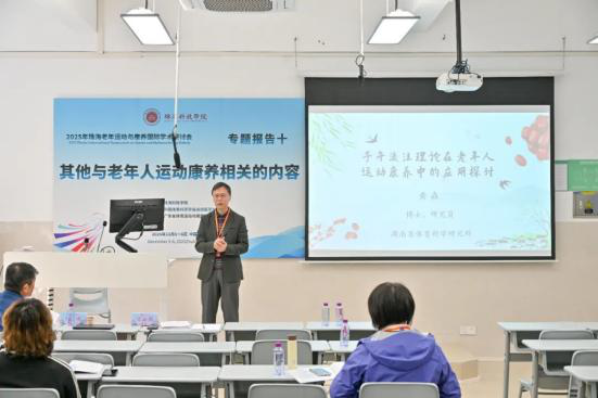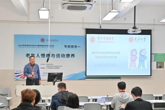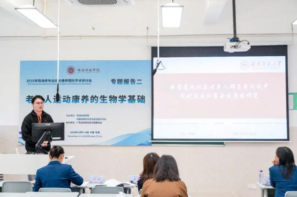 华南师范大学刘思聪教授以《健康饮食在中国青年人群健康行为网络中居核心位置》为主题,深入分析营养与老年运动康养的协同效应;陕西师范大学田振军教授解读《运动与“脑 -体 -认知”健康:来自神经系统衰老性疾病的基础研究》,为运动干预神经系统衰老提供科学支撑。 珠海科技学院林文弢教授作《老年康养仪器的研制与应用》报告,展示了学校在康养技术研发领域的实践成果。