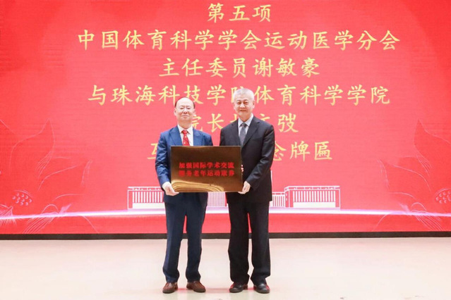 ▲中国体育科学学会运动医学分会主任委员谢敏豪与珠海科技学院体育科学学院院长林文弢互赠会议纪念